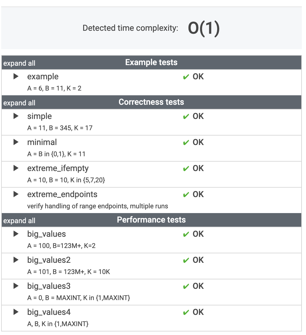 For example, for A = 6, B = 11 and K = 2, your function should return 3, because there are three numbers divisible by 2 within the range [6..11], namely 6, 8 and 10.